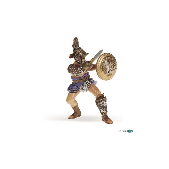 De gladiator staat in een dynamische houding, klaar voor de strijd, met een zwaard in de ene hand en een schild in de andere. Zijn uitrusting, waaronder de helm met gezichtsbescherming, het pantser en de sandalen, is nauwkeurig gedetailleerd.