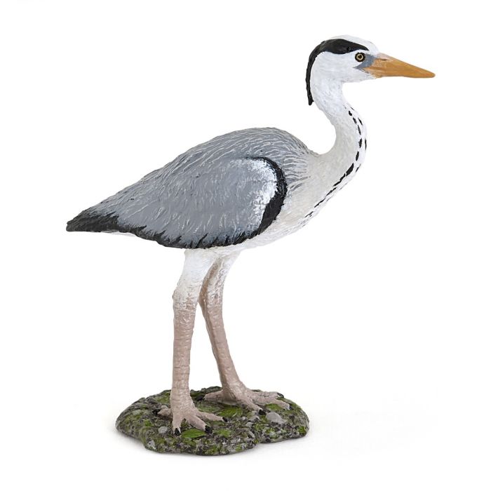 Dit  is een natuurgetrouw en met de hand beschilderd figuur van een grijze reiger. Het figuur toont een grijze reiger met nauwkeurig weergegeven lichaamskenmerken, zoals de kenmerkende grijze, zwart-witte bevedering, lange poten en een lange snavel.