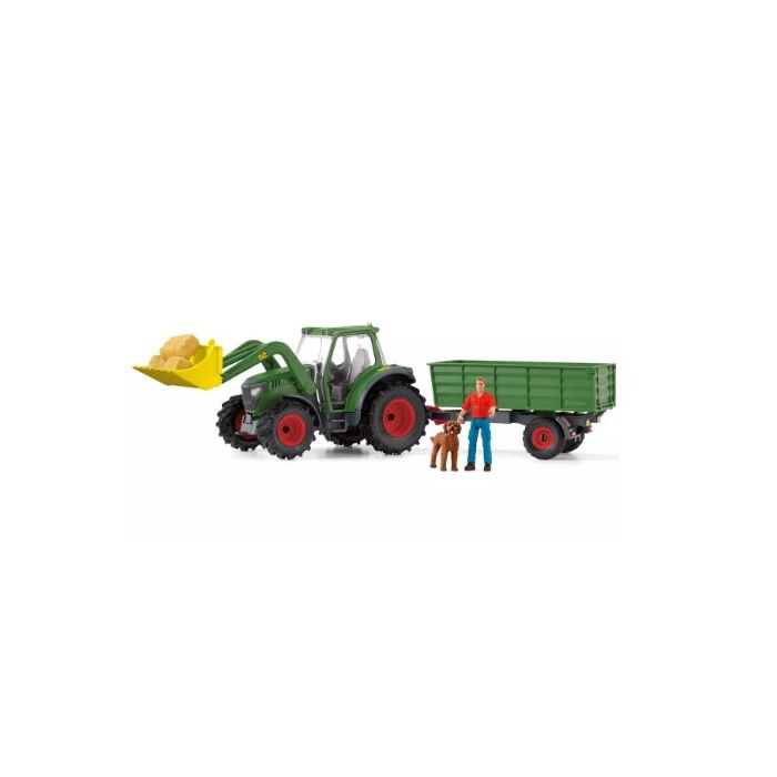 Dit is een speelgoedset die een gedetailleerde tractor en een bijpassende aanhangwagen bevat. De aanhangwagen kan worden gekoppeld aan de tractor en is ideaal voor het vervoeren van materialen op de boerderij, zoals hooi of boerderijdieren. De laadruimte van de aanhangwagen is ruim genoeg voor verschillende Schleich-accessoires, wat zorgt voor extra speelmogelijkheden en variatie.Â